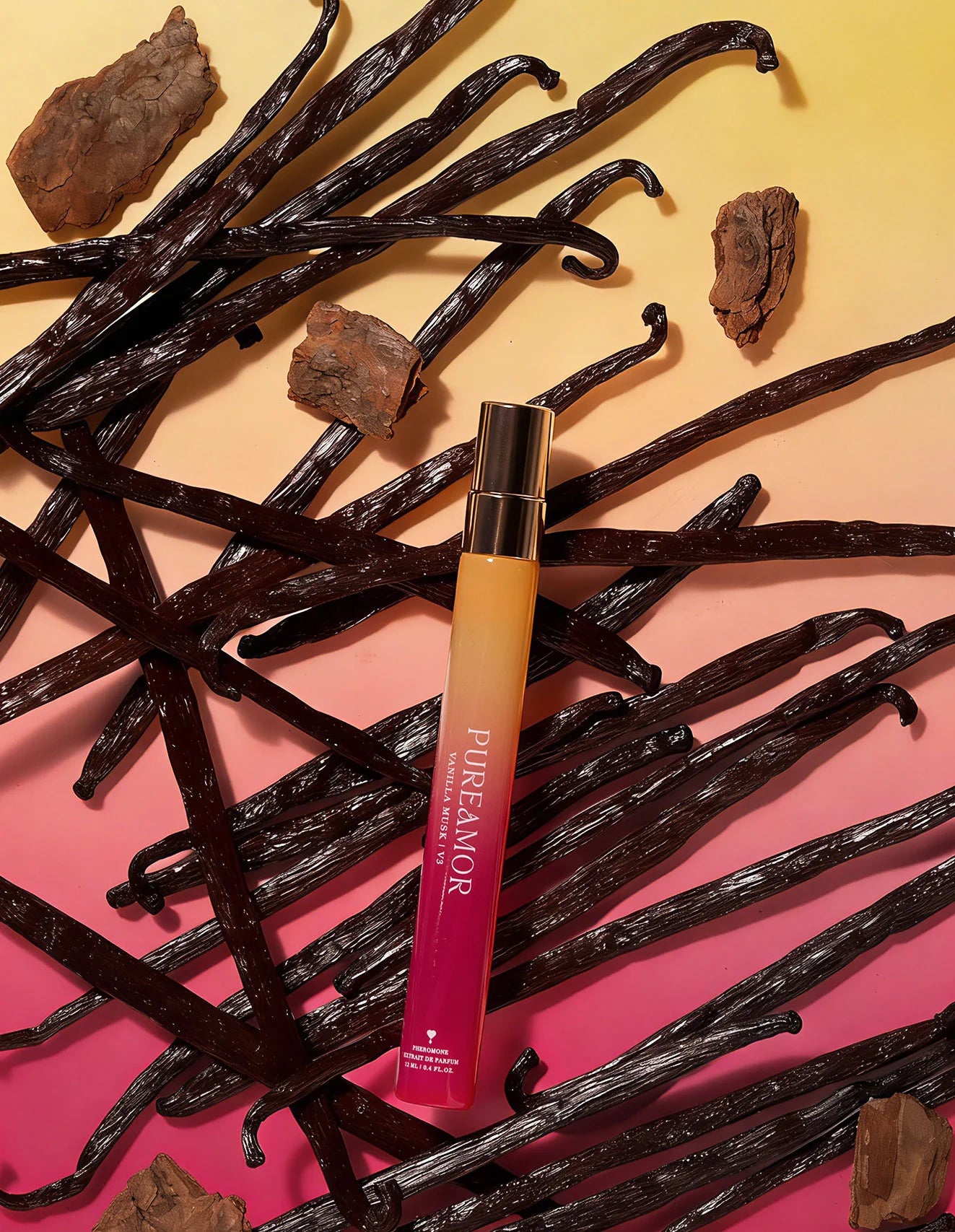 A warm, cozy pheromone perfume blending vanilla, soft woods, and musk into a sweet, dreamy scent that feels feminine, comforting, and irresistibly addictive.