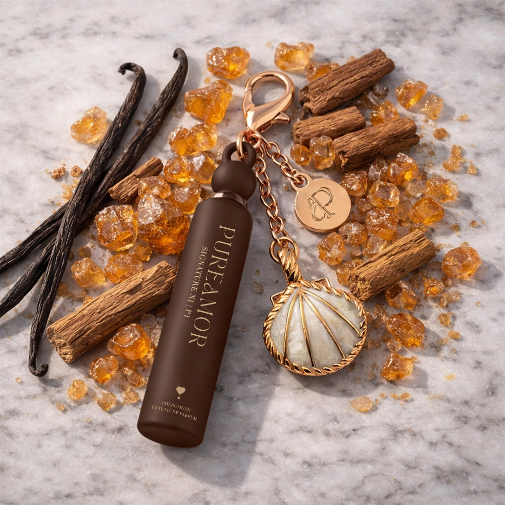 A warm, radiant pheromone perfume inspired by golden-hour romance. Opens bright with blackcurrant and bergamot, then melts into soft vanilla woods and jasmine for a skin-hugging finish that lingers.