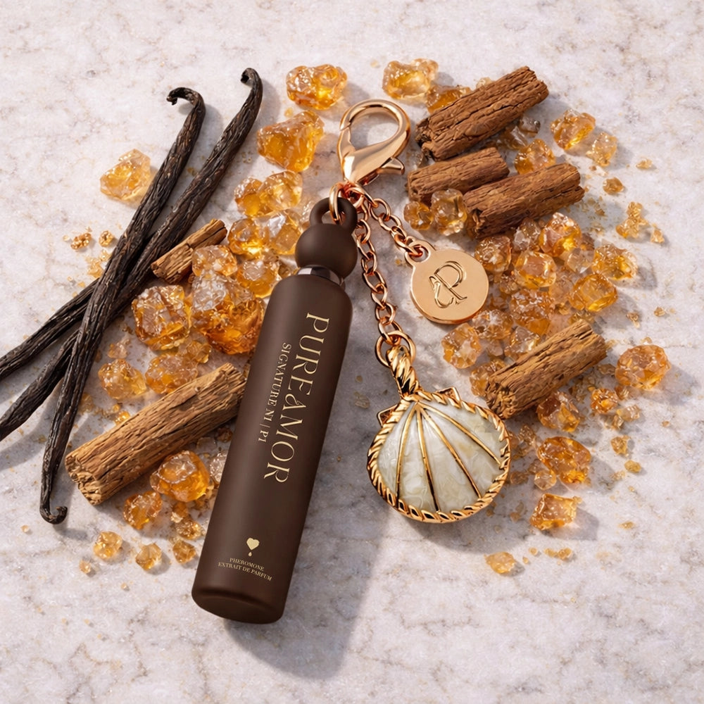 A warm, radiant pheromone perfume inspired by golden-hour romance. Opens bright with blackcurrant and bergamot, then melts into soft vanilla woods and jasmine for a skin-hugging finish that lingers.