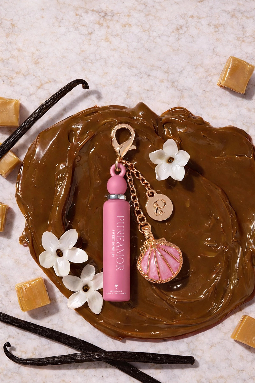 A warm, playful pheromone perfume where caramel, vanilla, and jasmine melt into a soft, inviting sweetness.